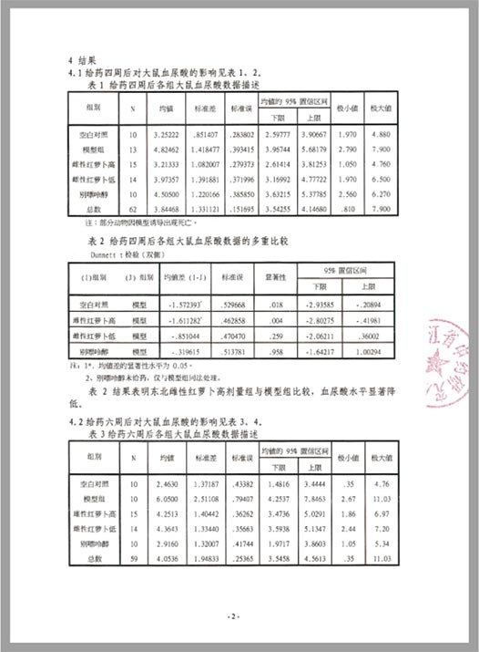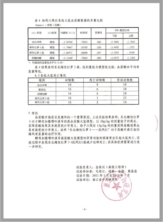 結論:血尿酸升高是引發(fā)痛風的一個重要原因。實驗結果表明,東北雌性紅蘿卜對于酵母加腺嘌呤誘導的高血尿酸大鼠模型,以30g/kg的劑量給予四周后,其降尿酸效果具有高度統(tǒng)計學意義。說明“抗風紅·東北雌性紅蘿卜”對于尿酸升高引起的痛風具有顯著的作用。