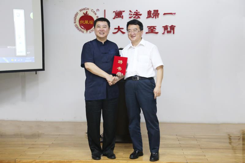 藥科大學副校長程卯生(右)為抗風竤董事長張芮袀(左)頒發(fā)聘書