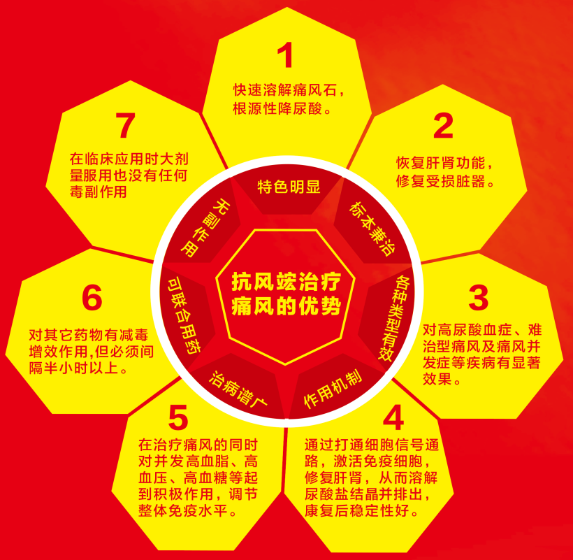 抗風(fēng)竤之所以受到市場如此多的關(guān)注,正是因為抗風(fēng)竤的產(chǎn)品優(yōu)越于藥物,綠色、安全、尊重自然,彌補(bǔ)了痛風(fēng)治療領(lǐng)域中,藥物和手術(shù)的不足,不用手術(shù)取石,避免患者受到二次傷害,其中包含以下優(yōu)勢: