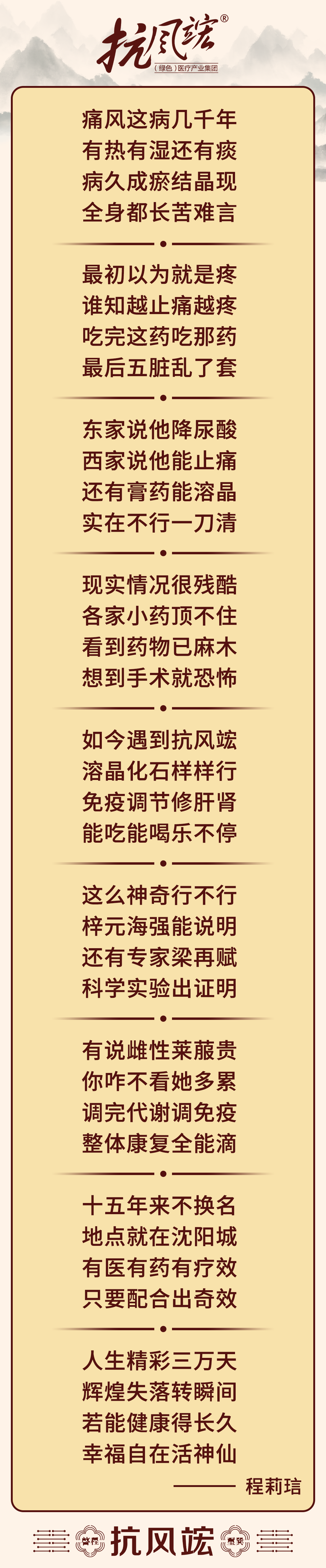 最后,程莉琂女士用通俗易懂的詩(shī)句總結(jié)了痛風(fēng)的發(fā)病、發(fā)展,風(fēng)友求醫(yī)問(wèn)藥的艱辛歷程,以及抗風(fēng)竤的治療特色、優(yōu)勢(shì),更表達(dá)了抗風(fēng)竤幫助廣大風(fēng)友遠(yuǎn)離痛風(fēng),阻擊痛風(fēng)的決心!